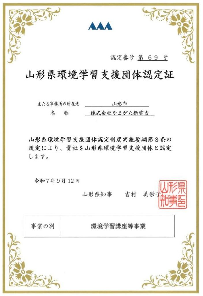 この度、山形県より「山形県環境学習支援団体」に認定されました。